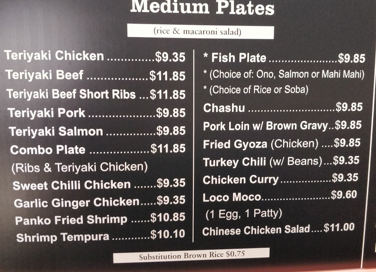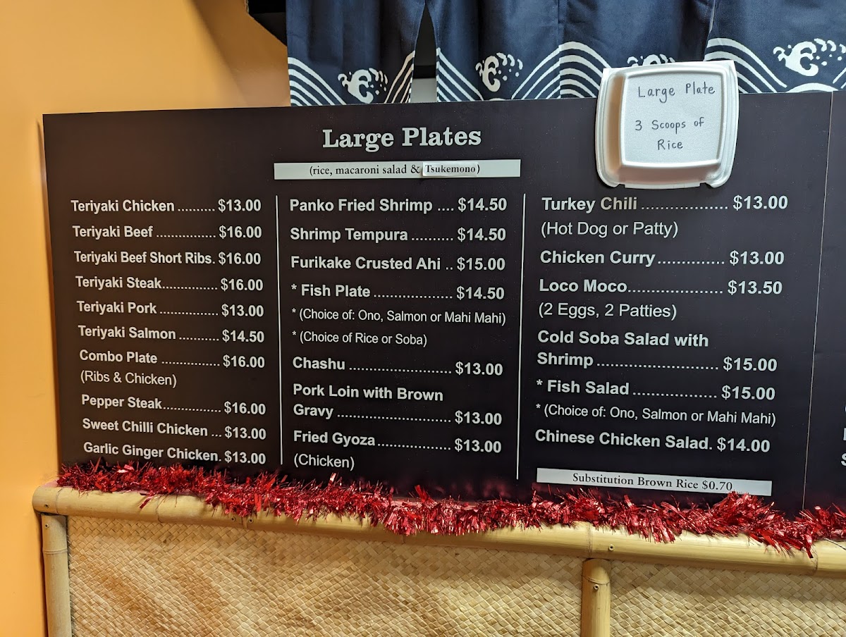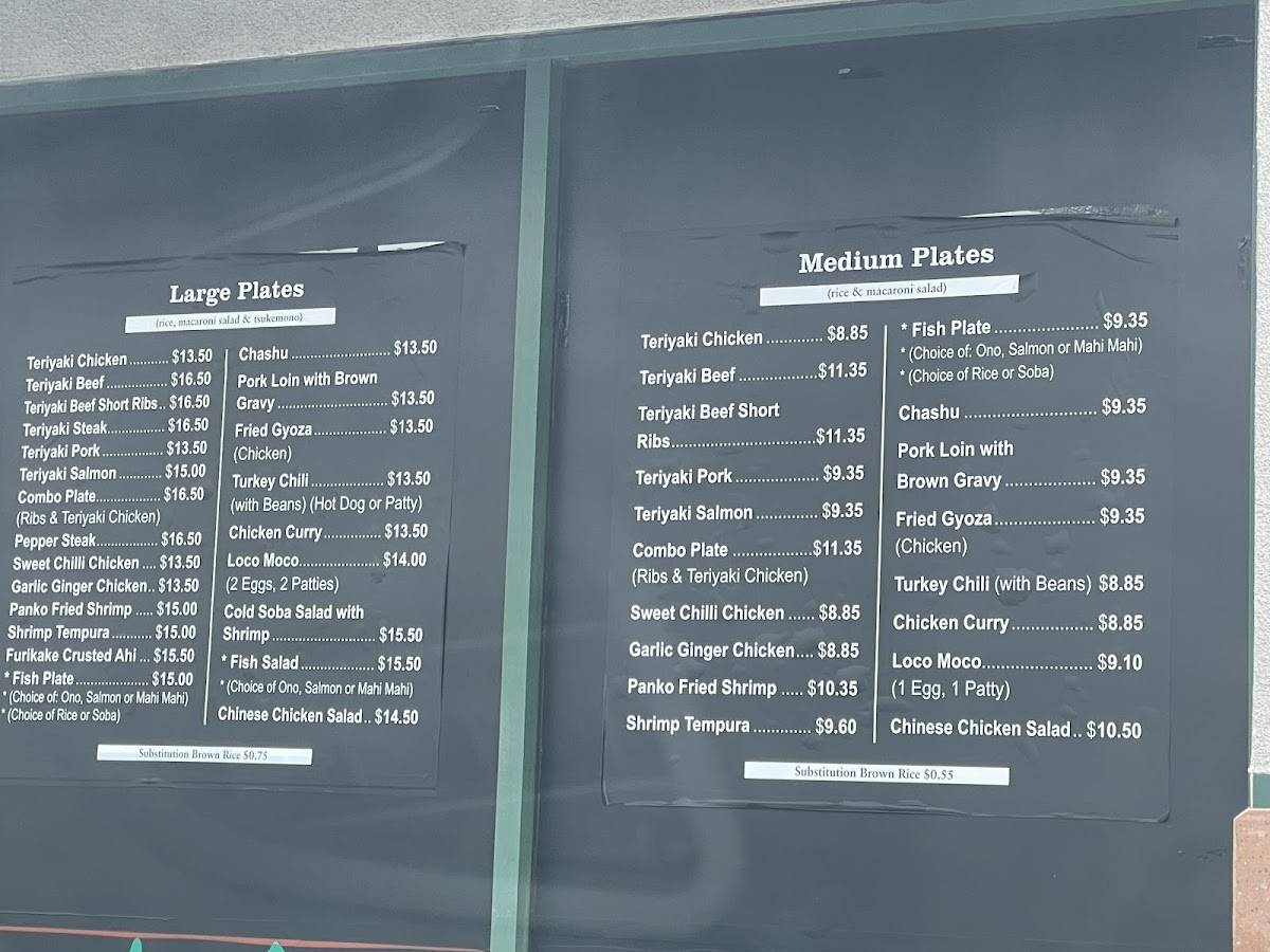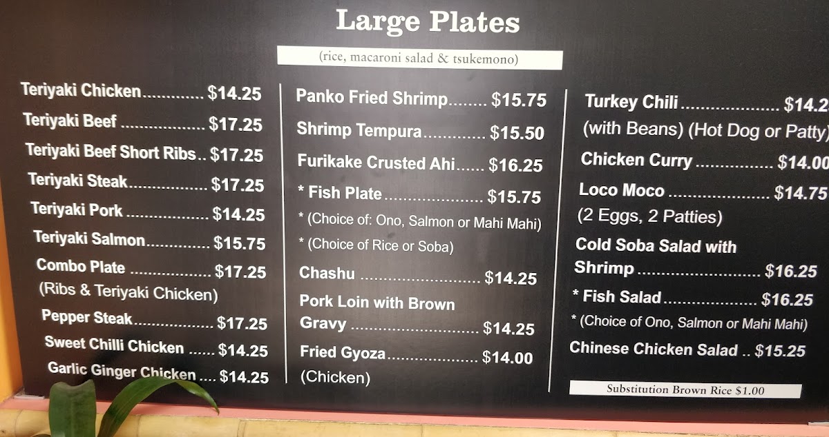 The menu is designed primarily for takeout, with some seating available for casual dining. It is well-suited for those seeking quick service and a variety of flavor profiles from Japanese and Hawaiian culinary traditions.
