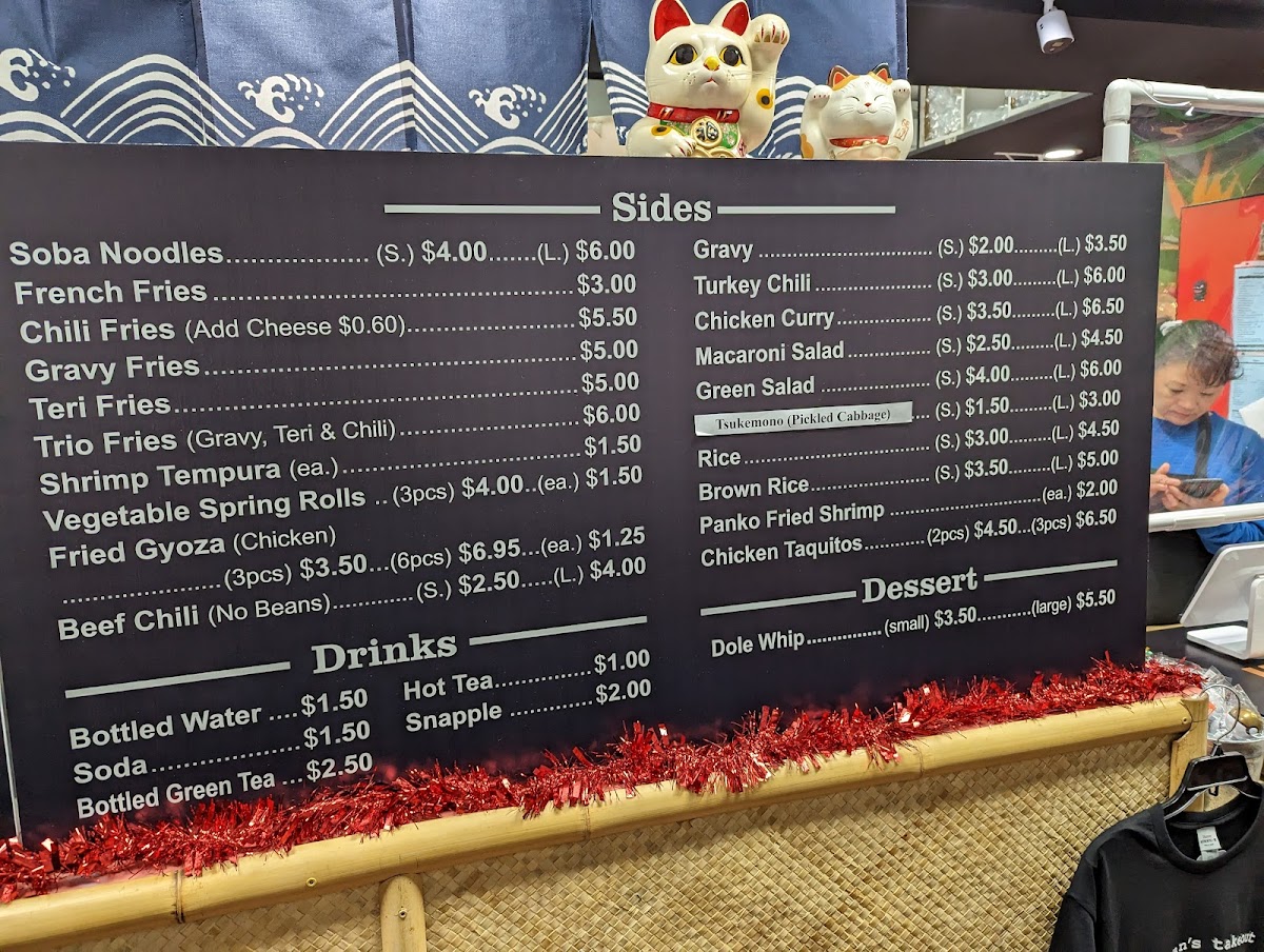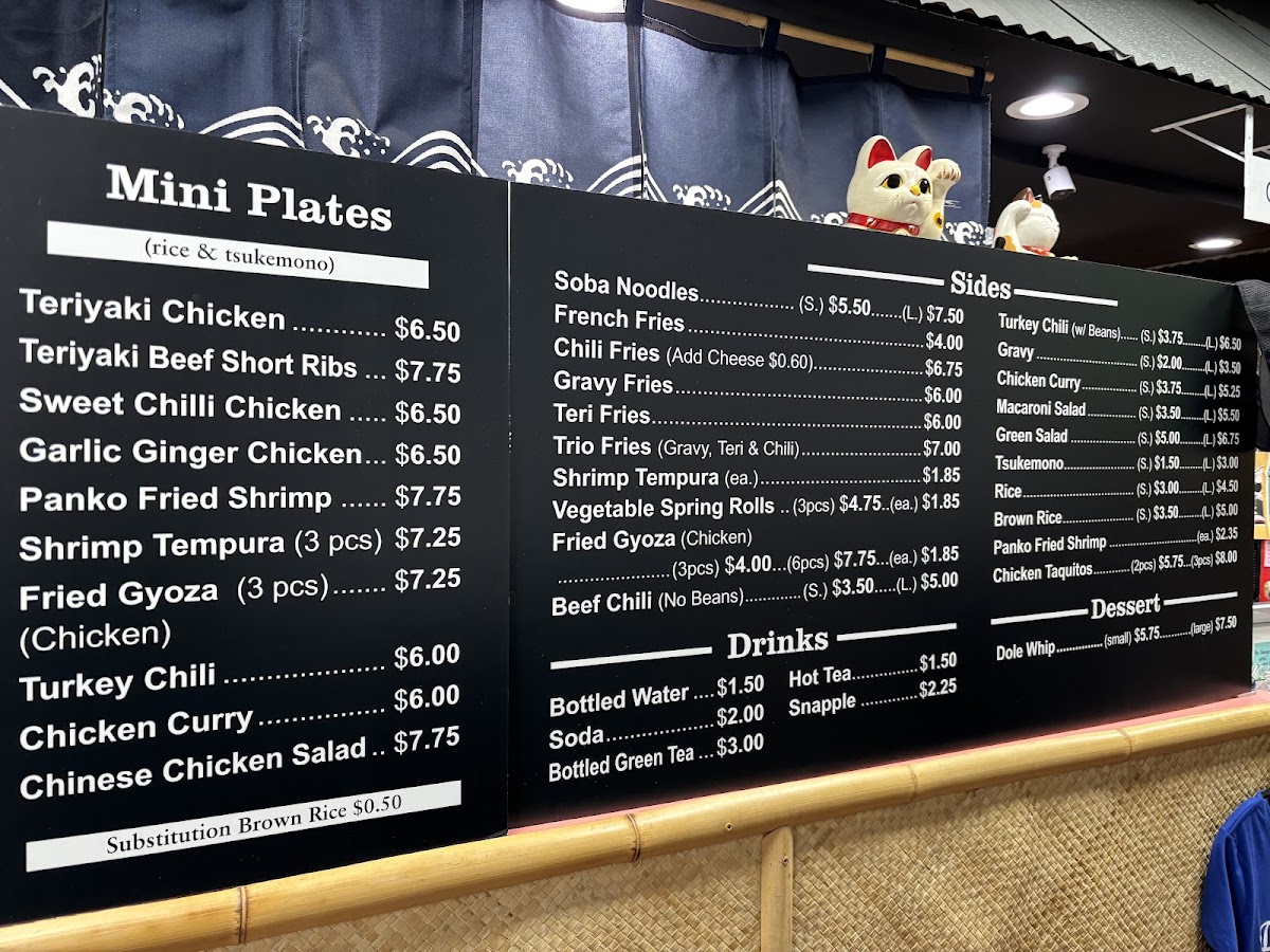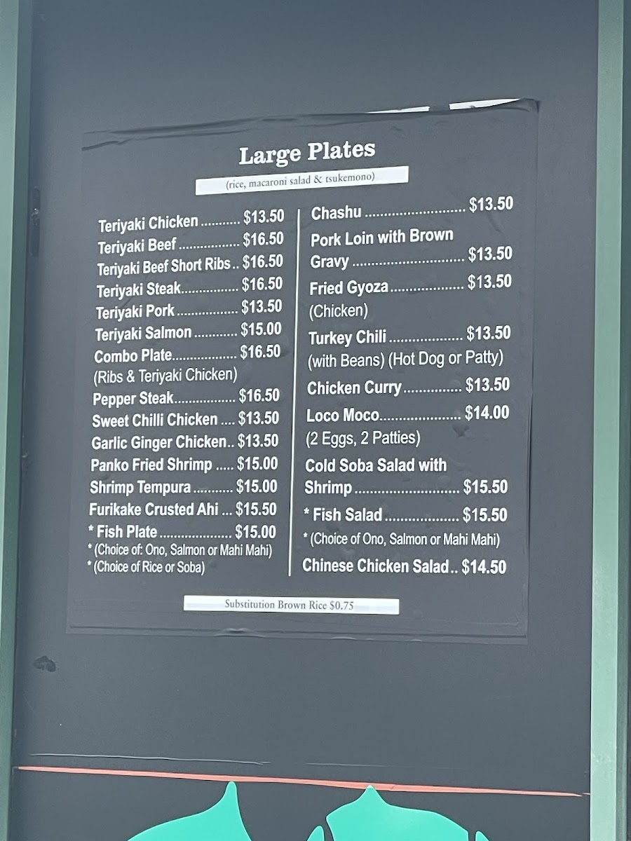 The menu is designed primarily for takeout, with some seating available for casual dining. It is well-suited for those seeking quick service and a variety of flavor profiles from Japanese and Hawaiian culinary traditions.